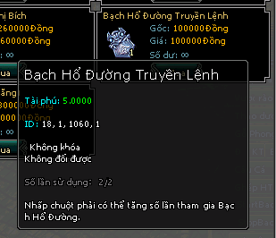 - Mỗi nhân vật tham gia Bạch Hổ Đường không giới hạn (Dùng Lệnh Bài)).